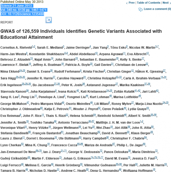 今日看到science一篇文章,参与单位高达129个, 作者多的都不在文章标题下面直接写了,而是放到文章末尾,。。。。。 做科研太不容易了 你见过作者和参与单位如此多的文章吗 由于文章作者较多,仅列出文章出处。。。 Science 21 June 2013: Vol. 340 no. 6139 pp. 1467-1471 DOI: 10.1126/science.1235488 sci.png |