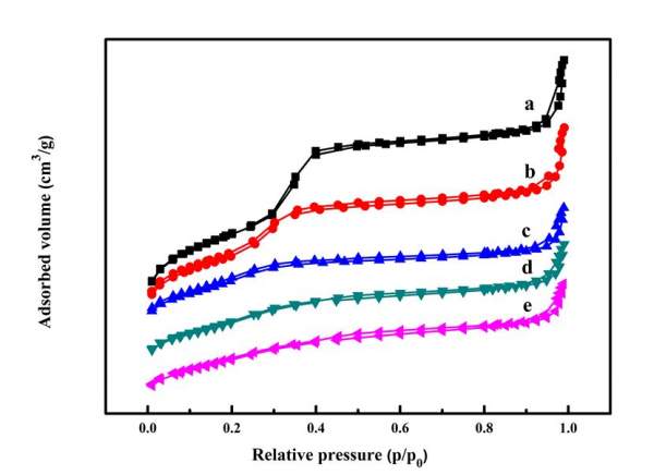 N2 adsorption-desorption isotherms of (a) MCM-41, (b) NH2-MCM-41, (c) 10% HPW-NH2-MCM-41, (d) 20% HPW-NH2-MCM-41 and (e) 30% HPW-NH2-MCM-41. 这是做出来的一个材料的N2吸附-脱附图,希望各位高手能帮忙分析一下,这是哪种吸附类型,并给出详细的理由,谢谢!图以文件的行驶上传的,谢谢各位! |