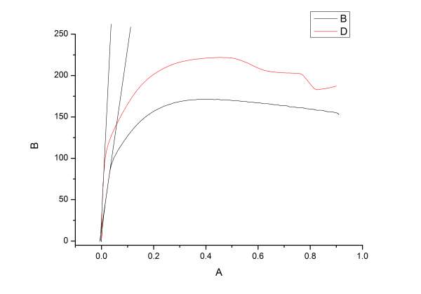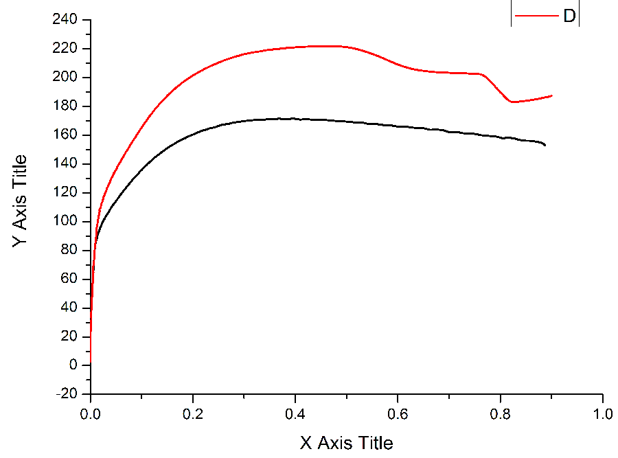 如图,由于设备原因,同种材料的弹性斜率不同。弹性模量只跟材料有关,所以想把弹性斜率较大的曲线进行修正,使其弹性区的斜率与曲线D相同,而弹性区后面的数据不发生改变!不知各位有什么好的办法,收到修正太慢,效率太低!附原始数据,望各位大神赐教! Graph1.jpg |