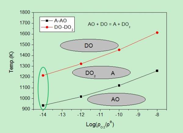 你说的不同气氛是指控制气氛的氧化性/还原性吧?我用f*a*c*t sage计算了一下两个平衡,如附件的图所示。发现 二价的AO、DO在同一气氛下,没有共同存在的温度区域。DO是高温区,AO是低温区,二者查200多K。由此,估计换气氛,是不是很难做到。我想到了微波烧结,根据物质对微波吸收不同,升温速率也不同,存在温度梯度,或许能实现相同气氛不同的温度。不知道我的想法可行性如何。有使用过微波烧结设备的吗?欢迎交流哈!