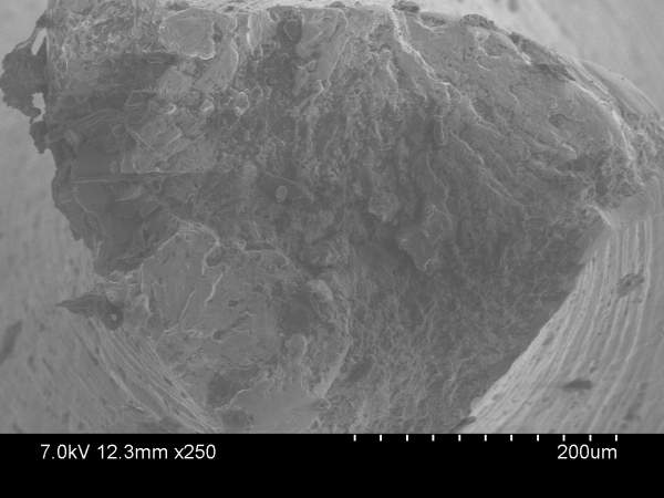 图一为断口全貌,图二为高倍下的断口形貌,该合金为镍钛合金,器械是在高周疲劳下断裂的,帮忙分析下断口形貌,图二中“箭头”指的是什么东西呢?? 2 F1(1)_1.jpg 2 F1(2).jpg 2 F1(1)_1.jpg 2 F1(2).jpg |