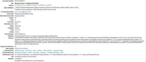 | 如题,文章为“N2O5/HNO3体系中硝解DADN的反应动力学[J], 化工学报, 2013,64(4):1269-1275”,想查看其EI收录号。 |