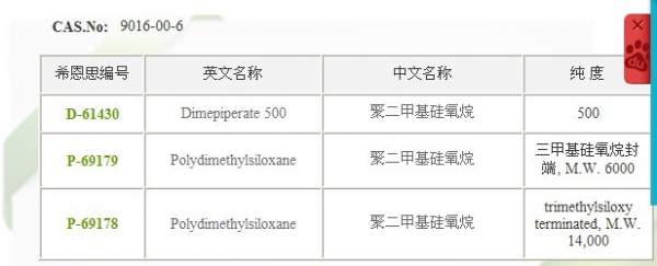 小弟要合成环糊精的聚合物--要合成球-----所以要加入PDMS, 要求粘度是50,100.或者1000MM2/S,文献上写的! 但是我现在联系卖药品的他们都不知道我要的是哪个型号,有谁做过相关的实验告诉小弟一下吧,小弟已经没别的办法了--求助指点!!!!到底我要买哪个产品,我截图给大家看看!或者谁用过告诉我一下在哪家能买到,给个联系方式吧!很着急! 123.jpg |