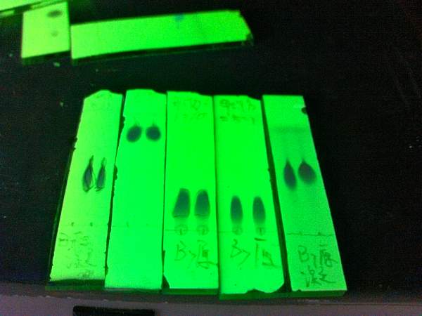 这五块板子是我用不同展开体系跑的,氯仿甲醇、乙酸乙酯甲醇、氯仿乙酸乙酯甲醇体系,是我乙酸乙酯段的 就一个点,但是往上有点拖尾,问一下各位分离大神我该怎么办,过硅胶柱,还是凝胶柱,还是直接挂板子,往各位指点一下,还有我想问一下,凝胶有除掉色带的作用,那色带是什么物质,在凝胶里什么时候下来 IMG_20130627_132915.jpg [ 来自小组 Natural Products家族 ] |