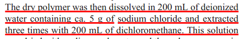 这两张图片来源于同一个瑞士实验室的不同作者文章,第一张讲到:聚合物溶解在氯化钠溶液,用二氯甲烷萃取。而第二张讲到:聚合物的二氯甲烷溶液用氯化钠溶液萃取。 这完全是两个相反的意思啊,是我理解有误还是文章的问题? 原始1.PNG 原始2.PNG |