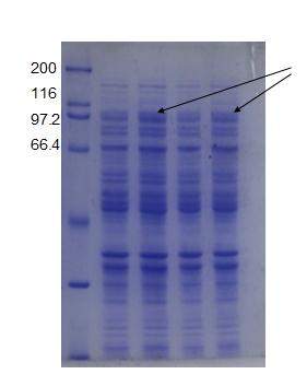 大家好,最近在做SDS-PAGE,大家帮帮看看这个图可以接着做WESTERN BLOT吗?我老板说这图表达量不行,不能接下来做WESTERN BLOT,我很是郁闷。(蛋白大小在marker97.2附近,1.3泳道是未诱导,2,4是诱导)请大家帮忙分析下是否有表达,谢谢!
