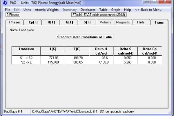 Phase Cp Range, K S1 litharge (red) 298.15 - 762.00 762.00 - 1159.00 1159.00 - 2000.0 S2 massicot (yellow) 298.15 - 1159.00 1159.00 - 2000.0 L liquid 298.15 - 1159.00 1159.00 - 2000.0 G gas 298.15 - 2500.00 这是在FactSage数据库中找到的PbO数据,请问“Cp Range”是什么意思?从这个表里可以知道litharge与massicot之间转化的温度吗? |
