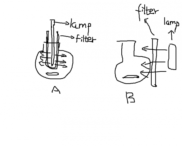 我们组最近也在搭这样的装置,我觉得应该是A那样的,我们也比较了A和B的装置优缺点,A装置更利于反应。A装置要是想滤光的话,可以直接加一个滤光管! 下面这个网址是全套的,你也可以自己组装! http://www.bjnbet.com/gd/2011/1104/169.html http://www.bjnbet.com/gd/2011/1118/180.html |