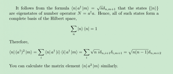 产生算符和湮灭算符在计算的时候有如下公式,说明矩阵只有在|n>和|n+1>两个态间有非零矩阵元,其他的矩阵元都为零。那么当中间是产生或者湮灭算符的平方项时该如何考虑呢? KQ11K]`AK4V`WRH$YIL0J55.jpg |