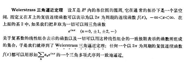 我给你些资料,一切尽在不言中; 吉田耕作,泛函分析,Page7-8.(stone-weierstrass定理,weierstrass三角逼近定理) Brezis,Functional analysis Sobolev sapce and PDEs,Page 167 and Page 232(第8章); 其实Fourier级数天生就是L2下完备的; weierstrass三角逼近定理针对三角级数,而不是Fourier级数; 外加个鲁津猜想:http://www.wordwendang.com/word_daxue/0612/634495_49.html 1.jpg 2.jpg |