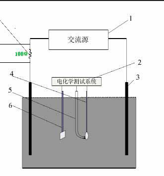 用中腐防蚀公司的PS268A系统测量Q235在砂土中的极化曲线,电压从-1000mV~400mV,做的是交流干扰,用电感耦合在两碳棒上施加交流干扰。最近测得曲线在电流密度为0附近范围扩大,使得极化曲线变形,求助高手这是怎么回事。谢谢~ 交流干扰1下的E-I图 交流干扰1下的E-log i 图 交流干扰2下的E-I图 交流干扰2下的E-log i 图 实验装置图,3、6是碳棒,4是工作电极 |