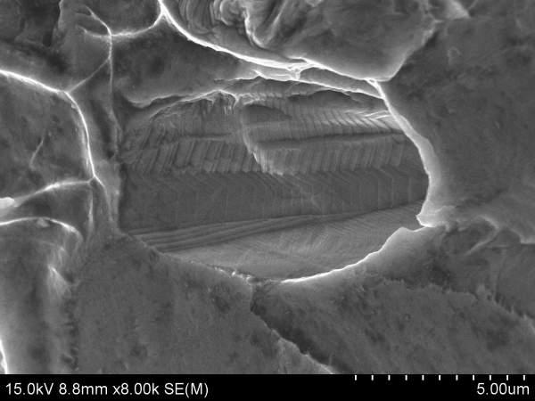 做的铸态锆合金的拉伸断口,拉伸塑性很差,不到5%. 从断口能看到裂纹源,在裂纹源处出现了图中所示形貌的孔洞,孔洞内的形貌如图所示,请大家给点意见,这个孔洞的形貌是怎么形成的。 cast_m010-1.JPG cast_m011.JPG |
