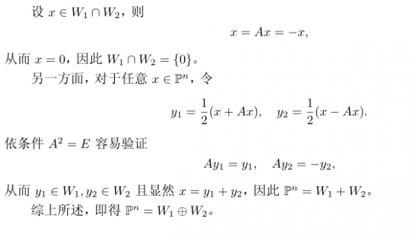 | 设A∈Mn(P)满足A^2=E,W1={X∈P^n|AX=X},W2={X∈P^n|AX=-X.}证明:证明P^n=W1⊕W2 |