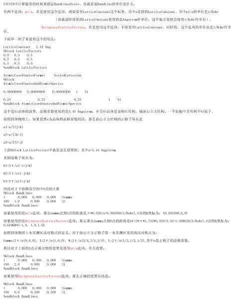 SIESTA中计算能带的时候要指定BandLinesScale,也就是说BandLine的单位是什么。 有两个选项: pi/a,若是使用这个选项,则需要有LatticeConstant这个标签。其中a是指的LatticeConstant。其中pi/a的单位是1/Bohr(也就说即使你的LattceConstant使用的是Angstrom作单位,这个地方依然会使用1/Bohr作单位)。 ReciprocalLatticeVectors,若是使用这个选项,不需要有LatticeConstant。同样的,这个选项的单位也是1/Bohr作单位。 下面举一例子来说明这个的用法: LatticeConstant 5.44 Ang %block LatticeVectors 0.0 0.5 0.5 0.5 0.0 0.5 0.5 0.5 0.0 %endblock LatticeVectors AtomicCoordinatesFormat ScaledCartesian %block AtomicCoordinatesAndAtomicSpecies 0.00000000 0.00000000 0.00000000 1 Si 0.25 0.25 0.25 1 Si %endblock AtomicCoordinatesAndAtomicSpecies 这个是Si晶体的设置,晶格常数使用的是5.44 Angstrom,并且Si晶体是金刚石结构,属面心立方结构。一个原胞中含有两个Si原子。 按照固体物理上,如果设置a为晶体的晶格常数的话,那么面心立方结构的正格子基矢是 a1=a/2(j+k) a2=a/2(k+i) a3=a/2(i+j) 上面%block LatticeVectors中就是这么设置的。其中a=5.44 Angstrom. 其倒易格子基矢为: b1=2π/a(-i+j+k) b2=2π/a(i-j+k) b3=2π/a(i+j-k) 因此对于下面倒易空间中O点的计算 %block BandLines 1 0.000 0.000 0.000 \Gamma 100 1.0 0.000 0.000 \O %endblock BandLines 如果使用的是pi/a选项,那么Gamma点到O点的距离是π*0.529/a=0.305599(1/Bohr),O点的K坐标为:(0.305599,0,0) 如果使用的是ReciprocalLatticeVectors选项,那么那么Gamma点到O点的距离是b1=2*π*1.732*0.529/5.44=1.058626(1/Bohr),O点的K坐标为:0.61068*(-1.0, 1.0,1.0) 按照固体物理上布里渊区高对称点的定义,对于面心立方正格子第一布里渊区常用的高对称点为: Gamma:2π/a(0,0,0), X:2π/a(1,0,0), K:2π/a(3/4,3/4,3/4), L:2π/a(1/2,1/2,1/2),其中a是正格子的晶格常数。 所以对于上面的X点正确方便的设置是使用pi/a选项,并且设置: %block BandLines 1 0.000 0.000 0.000 \Gamma 100 2.0 0.000 0.000 \X %endblock BandLines 如果使用ReciprocalLatticeVectors选项,那么正确的设置应该是: %block BandLines 1 0.000 0.000 0.000 \Gamma 100 0.0 0.500 0.500 \X %endblock BandLines |