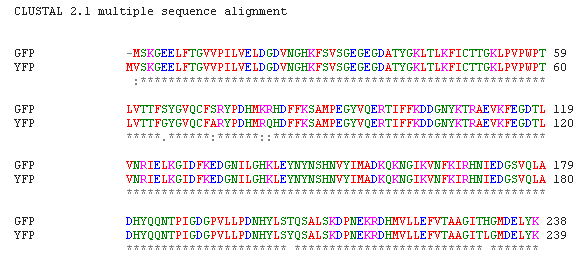 绿色荧光蛋白序列: http://www.snapgene.com/resource ... s_and_plasmids/GFP/ 黄色荧光蛋白序列: http://www.snapgene.com/resource ... s_and_plasmids/YFP/ 经过比对,找出残基差异,就知道GFP如何就可以突变成YFP |
