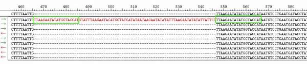 这条序列我一共送测了10个克隆,有2个克隆是没有缺失的,其余8个缺失了同样的碱基。可能PCR扩增确实有时产生了跳跃,只是不知道其机理是什么样的。