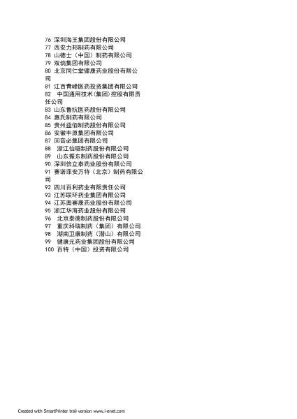 2012年度中国医药工业百强榜 中国医药工业信息中心于2013年7月17~19日在上海举行2013年(第30届)全国医药工业信息年会 暨2012年度中国医药工业百强榜单发布。即我们所说的工信部排名。这个排名在药品招标中将作为企业规模加分的依据。排名依据的数据与上市公司年报一样,是经过会计师事务所审计的。 排名原文:http://www.pharmadl.com:89/toplist100.aspx 文字版见PDF附件! 【评选规则】 1.“2012年度中国医药工业百强榜”评选时间跨度为整个2012年; 2.评选的统计指标依据为2012年医药工业主营业务收入; 3.评选的对象为中国境内注册、且以医药制造业为主营业务的制药企业,即在企业工商登记中,药品制造业务放于企业主营业务范围最前面的企业。如果评选企业含有医药商业或其他非医药类成份的,将剔除后再进行统计; 4.评选对象以工业企业法人单位为基础,对于已合并报表上报的法人单位,以该合并报表为基础,涵盖其已上报数据的子公司不再另行参与评选。 数据来源:中国医药统计网[ Last edited by maitians on 2013-7-17 at 18:06 ] |