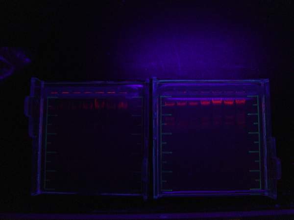 Ìáȡϸ¾ú»ùÒò×éDNAʱ×ÜÊÇ»áÓе°°×²ÐÁô£¬µçӾʱ£¬Óò»Í¬Å¨¶ÈµÄ½ºÅܳöÀ´µÄЧ¹û²î¾àÒ²ºÜÔ¶£¬×ó±ßÊÇ0.6%µÄ½ºÓÒ±ßÊÇ1.0%µÄ½º£¬£¬¼ÓÑù¿×Ï·½Ò»µãµãµÄÁÁÌõ´øÊDz»Êǵ°°×²ÐÁôµÄ½á¹û°¡£¿ DSC00591.JPG |