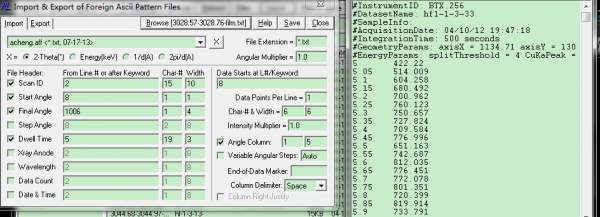 其实你没有看懂相关教程。 对于你的数据,图中左侧的Scan ID等4个复选框根本就不用选。 右边强度的起始位置和所占字符宽度(两个6)你是怎么数出来的? 起始位置从第6个字符开始是否正确?你的2theta有没有超过100度?如果超过了,如100.02是占了6个字符,那么,强度数据至少是从第7位开始。 强度数据所占字符宽度明显不对,注意,空格也算字符的!你把那个宽度6往大改再试试。 |