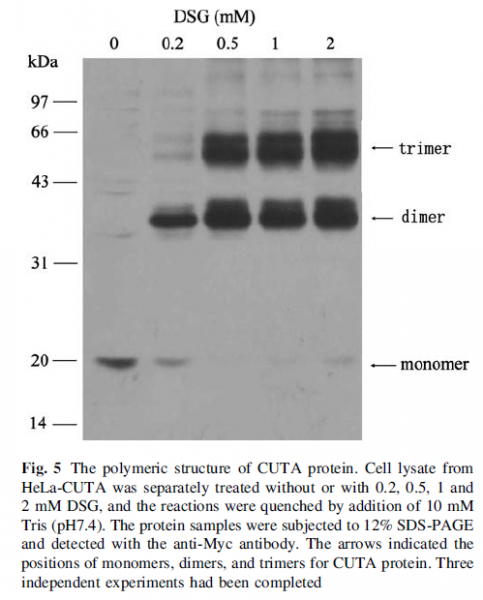 你可以通过交联的方法来测定是几聚体,给你个参考文献: Cross-linking To cross-link free amino groups of Myc-tagged CUTA protein, the HeLa-CUTA cells were lysed in the lysis buffer (5 mM EDTA, 0.2% Triton-x-100, 58 mM Na2HPO4, 17 mM NaH2PO4, 68 mM NaCl). Then 100 ll of cell lysate was incubated with disuccinimidyl glutarate (DSG) (Pierce) of different concentration for 1 h on ice. The reaction was quenched with 10 mM Tris (pH 7.4) and the protein samples diluted in 5· loading buffer (Tris–HCl (pH 6.8), 0.25% bromophenol blue, 2% SDS, 10% glycerol, 0.1 M DTT) were run on a 12% SDS-polyacrylamide gel for Western blot analysis. 出处:http://www.ncbi.nlm.nih.gov/pubmed/17924204 |