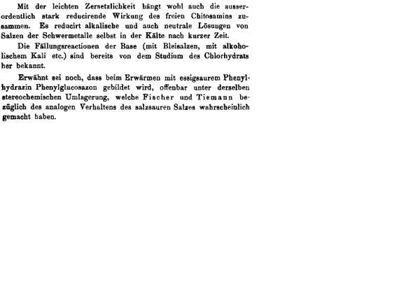 这里的德语原文很简捷,不易翻译,要加词。现译出如下: 自由的2-氨基葡萄糖(即:非壳糖胺的盐)的特别强的还原作用和其易分解性是相关联的,因而,它还原重金属盐的碱性和中性溶液是在冷却条件下短时间内完成。 通过HCl进行碱沉淀反应(用铅盐,在醇钾等条件下)的研究早就是已知的。 还需提及的,乙酸苯肼(译注,这里应加上:与壳糖胺)在加热条件下可制得苯基葡糖脎,很明显,对于盐酸盐(译注,这里应是加上:壳糖胺盐酸盐)的相似的结果Fischer与Tiemann也许已做过同样的立体转换。 |
