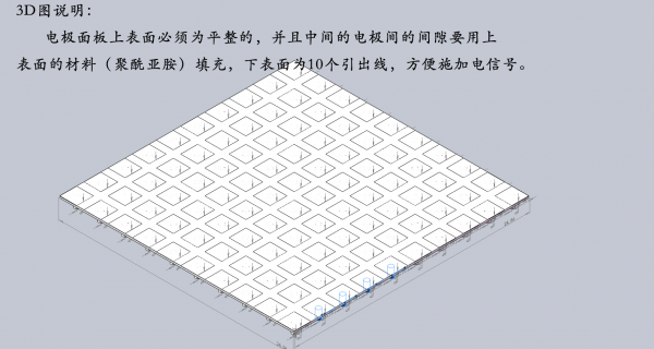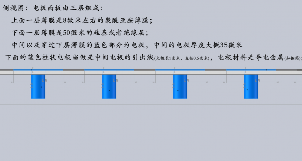 ps:电极面板尺寸除了上面一层是平整的聚酰亚胺薄膜,并且厚度在5-15微米厚的要求之外,其它的参数均可以随着加工工艺而更改;(这个图毕竟只是草图)