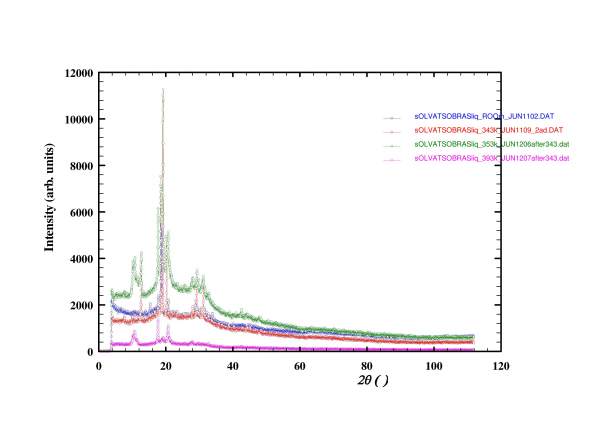 为(CBr2Me2)与C60的xrd结果。溶剂纯CBr2Me2熔点216k,有一个相变点在260k左右,沸点为114°C. 溶质纯C60在259k C60由SC变化为FCC。做了特定浓度随着温度的xrd,但是结果很奇怪。貌似随着温度有很多种结构,由于这是新物种,本人从来没有这方面的经验,dsc结果也发上来了相变温度可以得到(70ºC左右的相变峰总在移动,有时候在65ºC就发生了).