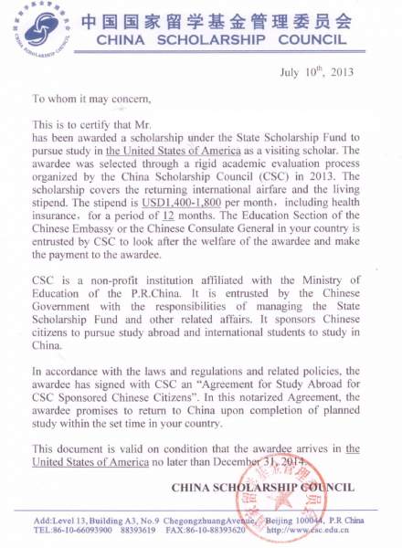 恭喜楼主!问一下你的项目是国家公派高级研究学者及访问学者(渠道:单位或个人渠道)项目吗?英文资助上有单位名称吗? 我现在要换学校,CSC说如果项目资助没写学校还好办一些,我还没拿到证明,望告之,谢谢!!