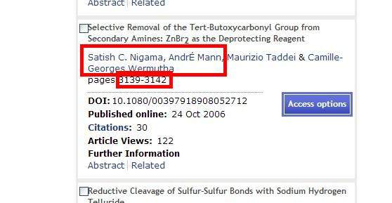 以http://muchong.com/bbs/viewthread.php?tid=6152162&fpage=1这个帖子为例: 缺少标题。可以从期刊入手: Synthetic Communications 这个期刊是taylor数据库里面的常见期刊(不知道也没关系) 谷歌搜索期刊名:Synth. Commun 点击进入第二个链接 Synthetic Communications: An International Journal for Rapid http://www.tandfonline.com/loi/lsyc20#.UezMzh0dgdg 这里可以看到这个期刊的所有卷 所需文献是1989、19卷,点击相关卷即可,http://www.tandfonline.com/loi/l ... repitition=0#vol_19 求助信息中也缺少期,不过没关系,可以按照页码查找 找到对应的文章之后,可以把作者信息跟求助的信息核对,此处完全一致。 大致就是这个步骤。当然每个数据库稍微都不一样,有些数据库都是有高级检索的,直接在相关位置输入即可。也可以通过作者进行查找,不过方法都大同小异了。希望对你有帮助。 |