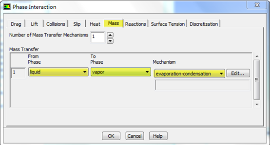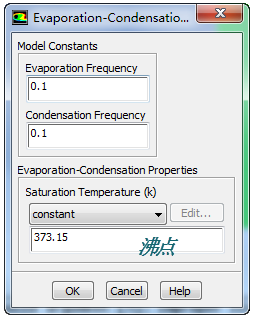 Enter the Evaporation Frequency and Condensation Frequency model constants. Those values are 0.1 by default. Note that the bubble diameter and accommodation coefficient are usually not very well known, which is why the coefficient (Equation 17–406 in the Theory Guide) can be fine tuned to match experimental data. 17-406是定义式,还有蒸发速率的定义式,不知道如何插入图片,将就看吧 |