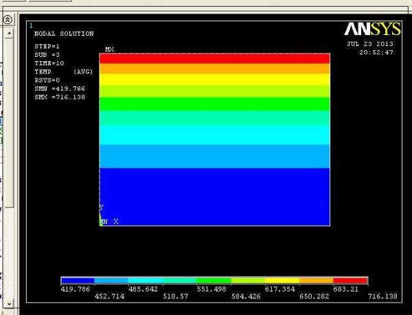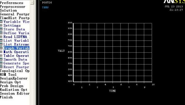 我在做温度场分析,矩形面,照书上,将矩形面1/4作为模型,可以得出温度场图及温度随时间变化曲线图。我又将整个矩形面作为模型,得出温度场图,但曲线图就出不来,不知为什么,请各位指教。如图: