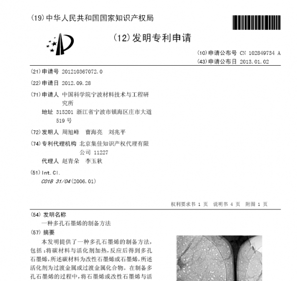 多孔石墨烯材料或三维石墨烯及应用相关专利 全文30余篇