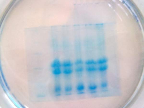 做的是娃哈哈乳饮料的蛋白质测定,直接从买来的乳饮料中取样跑电泳。用的是15%的分离胶和5%的浓缩胶,但是跑出来的marker只有三条带,而且颜色非常淡,样品跑出来条带拖尾,非常不理想,请问是什么原因呢???求指导那,跑了三四次都这样,试剂溶液都是新配的,marker也是新买的。 201307243056.jpg |