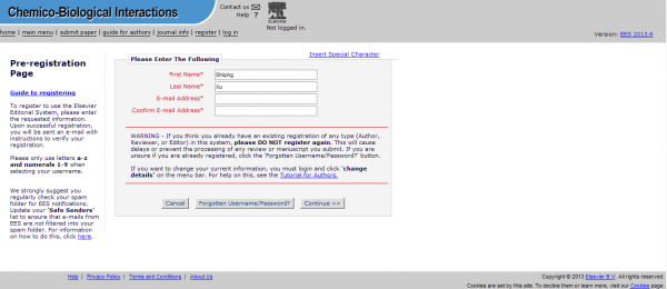 各位前辈们 我之前投过EES系统的其他杂志,但是被退稿,现在重新选择的杂志,再注册的时候却不能注册了。 点击注册按钮,显示的是下面这张图(1) 然后输入了姓名和邮箱之后,就变成了图2这样 之后我不管输入什么密码都不行了,不管是新设置的密码,还是以前注册EES用过的密码,全都不能用。 有木有大神可以指导一下,具体怎么操作? 1.png 2.png |