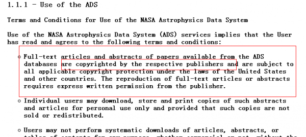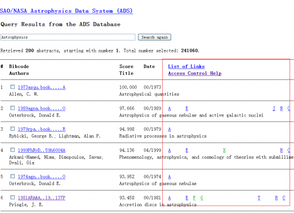 SAO/NASA Astrophysics Data System (ADS)天体物理学数据系统 http://libweb.zju.edu.cn/libweb/ ... p;amp;wlzy_id=42615 What is the ADS? This service provides access to three databases containing more than 8 million abstracts: Astronomy and Astrophysics, Physics and Geophysics, and the arXiv.org preprints in Astronomy. Users can use one of the available query forms to submit queries by author, object name, date range, words in the title, and words in the abstract text. The resulting list of bibliographic records is ranked by how closely each record matched the query. From this list, users can obtain on a record by record basis all the information available about a particular bibliographic entry (including the bibliographic code, title, authors, author affiliations, journal reference, publication date, category, comments, origin, keywords, and abstract text when available). 参见数据库网站http://doc.adsabs.harvard.edu/ab ... s/overview.html#use Full-text articles and abstracts of papers available from the ADS databases are copyrighted by the respective publishers and are subject to all applicable copyright protection under the laws of the United States and other countries. 这个数据库是一个文摘数据库,像web of science一样会提供全文链接 楼主以关键词检索,在检索结果中会提供全文连接(若有全文),也偶尔遇到有全文但是ADS数据库没有提供全文连接的,这种情况很少。 例如,我以“Astrophysics”进行检索 图中的Access Control Help 有A、B..... F 表示有PDF全文,其余的参见下面的帮助 Abbrev. Link Type Explanation A Abstract Full abstract of the article. (These abstracts come from different sources) C Citations A list of articles that cite the current article. (This list is not necessarily complete) D On-line Data Links to on-line data at other data centers. E Electronic Article Links to the on-line version of the article. These on-line versions are in HTML format for viewing on-screen, not for printing. F Printable Article Links to on-line articles in PDF or Postscript format for printing. G Gif Images Links to the images of scanned articles in the ADS Article Service. H HEP/Spires Information Links to on-line articles at the HEP/Spires database. I Author Comments Links to author supplied additional information (e.g. corrections, additional references, links to data, etc.) L Library Entries Links to entries in the Library of Congress and other on-line library system. M Multimedia Links to on-line presentations related to bibliographic record. N NED Objects Access to the lists of objects for the current article in the NED database. O Associated Articles A list of articles that are associated with the current article. These can be errata or other articles in a series. P Planetary Data System Links to datasets at the Planetary Data System. R References A list of articles referred to in the current article. For older articles these lists are not necessarily complete, they contain only references to articles that are in the ADS database. For some articles that are on-line in electronic form, the "R" link points to the on-line reference list, and therefore the complete list of references in that article. S SIMBAD Objects Access to the lists of objects for the current article in the SIMBAD database. T Table of Contents Links to the list of all articles in a books or proceedings volume. U Also Read Links to the list of articles also read by users who have read this article. X arXiv e-print Links to on-line articles in the arXiv database. Z Abstract If you have specified a custom format for abstracts, this link will retrieve abstracts in your custom format [ Last edited by flywlc on 2013-7-30 at 11:43 ] |