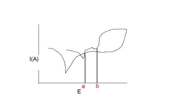 请教一下各位电化学高手,如果测出某种不锈钢的循环伏安曲线如图中所示,当回扫电位b 时,电流值明显回落,而于a点时才和初始的曲线相交,请问这种情况下,应该是算哪一个值为该钢种的再钝化电位? 另外,如果a值已偏离钝化区间呢(比如在阴极电位范围内)? 谢谢大家 示意.jpg |