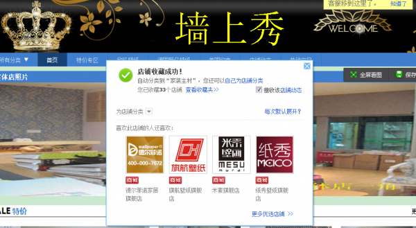 墙纸实体店外的淘宝墙纸店开业啦!想让墙壁变漂亮的朋友联系我哦,收藏送金币