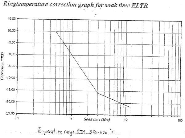 保温时间和温度的关系,比如测温环在烧过之后你测了一个尺寸,你在温度和尺寸的对应表上找到相应的温度,但这个是默认的保温时间是一个小时的情况,如果你在烧的过程中保温时间超过一个小时的话就应该按照这个保温时间和温度的关系,保温10h就要在你得到温度的基础上再减掉20℃左右,因为保温时间越长收缩的越多,这个是补偿曲线
