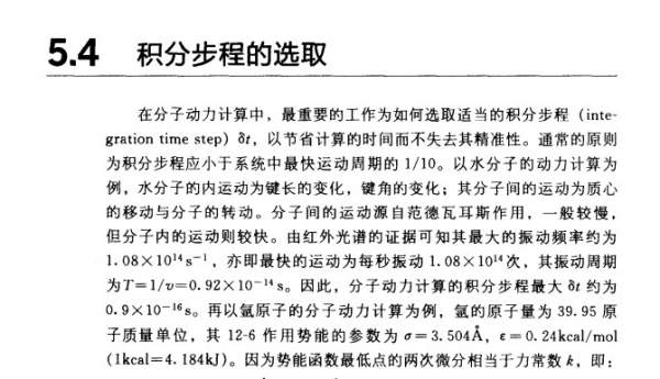 审稿人说的那本书在这里下载 http://ishare.iask.sina.com.cn/f/16968127.html 这本书41页讲的是简化单位的问题,完全不是什么时间尺度 而且积分步长本来就是人为指定的,一般在溶液中视情况定位2fs或1fs,在真空中定为0.5fs,当然具体的原因可以看陈正隆的那本书,不过没有哪篇论文会去讲积分步长是怎么选择的。。。 怀疑审稿人不是专业做分子模拟的,随便提了个问题敷衍了事,你可以和你导师商量下怎么弄 |