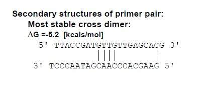 实在是找不到合适的引物对了,只有看看这个有cross dimer的引物对(二聚体配对碱基数达到了5个)行不行了。 打算利用dimer tm值与产物tm值得差,来排除二聚体对荧光的影响。 但是,我不知道这个dimer的tm值是多少,我的产物tm值有85左右。 SXT(62FS9`9ZIX[OY8VV[@L.jpg |
