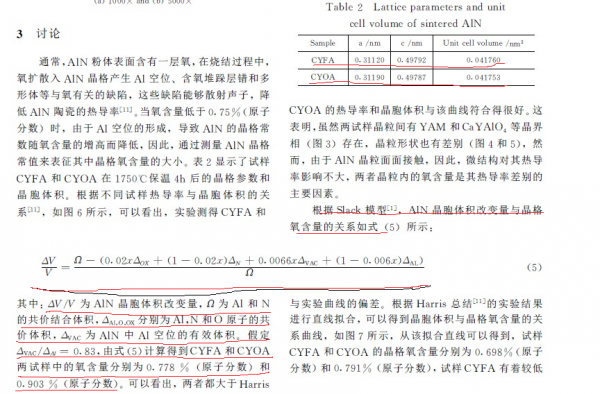 各位: 最近在文章中看到关于氮化铝晶胞体积与氧含量关系,里面有一个公式(具体见图中红色标记),对其中的晶胞体积改变量、共价结合体积、共价体积等概念以及具体数值不太懂,还望各位高手能指点迷津。不甚感激! 无标题.png |