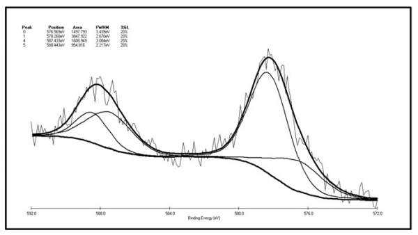 可能是Cr2p3/2峰,你看下吧 578.1 Cr2p3/2 Cr2O3 in alloy 33 after sputtering the passive film 578.1 Cr2p3/2 Cr2O3 in alloy 24 after sputtering the passive film 578.2 Cr2p3/2 Cr et Cr(III) dans Cr2O3 ou Cr(III) dans Cr(OH)3 578.2 Cr2p3/2 Cr Ox in 316 L alloy dipped in physiological serum 578.2 Cr2p3/2 Cr Ox in 316 L pot anod (5V for 5 min) in physio serum 578.5 Cr2p3/2 Cr-Cl with a sample immersed in a room t° solution |