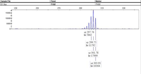如图, 横坐标表示的是片段大小,单位bp;纵坐标是啥呢,没看懂。 这对引物的目的片段大小是320、324,图中的的值都不符合,我减去引物片段的长度19bp后,最后两个峰的大小勉强能对上。 是这样看的吗?有两个值能对上是不是说明这个个体是杂合体? QQ截图20130810143102.jpg |