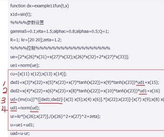 非常感谢您的指点。送花一朵。。 ![]() ![]() ![]() 按照您的建议,我把那几行的程序重新调整了一下。。但是还是运行部了。。显示矩阵维数不对。。但是我检查了好几遍,感觉程序里面的矩阵的维数是对的。。请您指点。程序如下: cu=[x(11) x(12);x(13) x(14)]; ud=cu'*([x(22);x(23)]-[x(3) x(5);x(4) x(6)]*[x(22);x(23)]-[x(7) x(9);x(8) x(10)]*[tanh(x(22));tanh(x(23))]-[x(15);x(16)]); ud1=norm(ud); ur=kr*[x(26);x(27)]./(x(26)^2+x(27)^2+zeta); ur1=norm(ur); u=ue1+ud1; uad=u-ur1; 非常感谢您! ![]() |