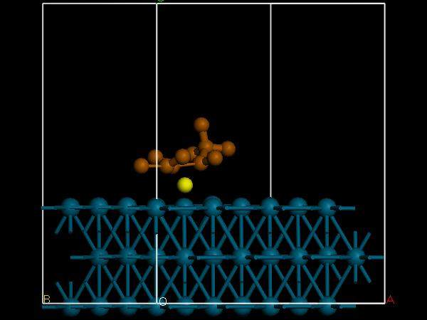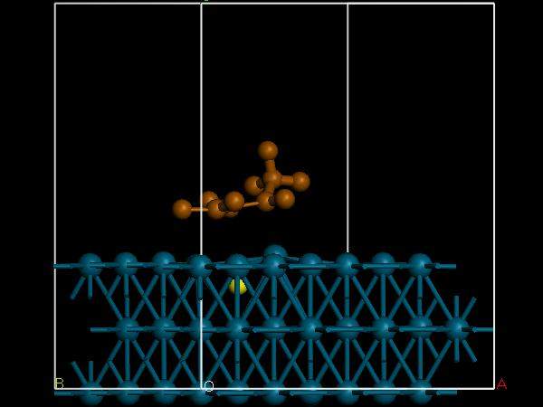 我在共吸附的计算过程中,发现共吸附模型在优化过程中,原子跑到了层板里面去了,如下图:黄色原子和褐色分子的共吸附模型,在优化过程中,黄色原子和褐色分子距离逐渐变远,黄色的原子跑到了金属层板的里面去了,我看出现这样的情况就把计算给停掉了,没有继续计算下去~具体参数是考虑了底层金属固定,上两层原子自由移动的情况