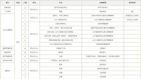 部门 岗位 人数 学历 专业 任教课程 其他要求 经管学院 教师 3 硕士及以上 资产评估相关专业 资产评估专业 人文学院 1 英语 英语相关 专8 土木工程学院 1 本科及以上 给排水、市政工程专业 给排水科学与工程专业课程教学 副高级及以上职称 1 土木工程相关专业 土木工程类施工课程教学 中级及以上职称 3 硕士及以上 工程力学类专业 力学类课程教学 1 供热、供燃气、通风及空调工程 建筑环境与设备工程专业课程教学 3 结构工程(土木工程施工技术与管理) 土木建筑类专业施工课程教学 6 结构工程(混凝土结构 钢结构、工程结构抗震 土木建筑类专业结构课程教学 2 桥梁与隧道工程、道路与铁道工程 土木工程类专业结构课程教学 3 土木工程相关专业及机械类专业 工程制图类课程教学 建筑管理学院 10 硕士及以上 工程造价方向 工程造价 建筑学院 10 本科及以上 建筑学 建筑设计 电气信息学院 5 硕士及以上 机械 机械设计技术、机械制造技术、流体传动与控制 艺术设计学院 4 硕士及以上 环境艺术(室外景观方向) 环艺相关 基础部 2 硕士及以上 数学 数学相关 2 两课 思想政治理论等 1 物理 大学物理 1 体育 大学体育 |