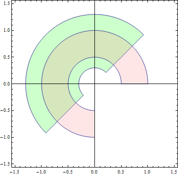 用Mathematica模仿一下, ewrwerwar.png (*-------------------------------------------------*) plt = ParametricPlot[r {Cos[t Pi], Sin[t Pi]}, #1, #2, Mesh -> None, PlotStyle -> #3] &; plt @@@ {{{t, 0.25, 1.25}, {r, 0.3, 1.3}, Green}, {{t, 0, 1.5}, {r, 0.5, 1}, Pink}}; Show[%, PlotRange -> 1.5] (*-------------------------------------------------*) [ Last edited by chyanog on 2013-8-13 at 12:41 ] |