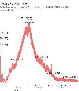 我将A和B反应,产物为AB或者AB2,对应分子量分别为1700和2500多,打Maldi Tof Ms出现如图所示包峰,这是为什么,怎么解决。我的样品为水溶性样品