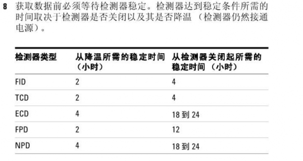 检测器在关闭状态下开启,需要平衡4h。GC平时是热启动(晚上不关机),如果是冷启动(晚上关机,第二天启动)的话需要平衡4h。不知道对不对,仅供参考!