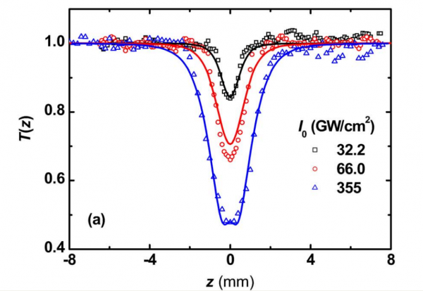 小弟最近刚刚接触一些超快和非线性光学特性的知识,有好多地方不懂,在此想请教大家: 开孔Z-scan技术及pump-probe测试,如何计算双光子非线性吸收系数、双光子吸收截面、激光的功率密度,归一化透过率是用的什么公式,焦斑半径是怎么测的,要计算这些参数需要知道哪些条件?这个图是怎么做的?图中的激光的功率密度I0怎么得到的? |